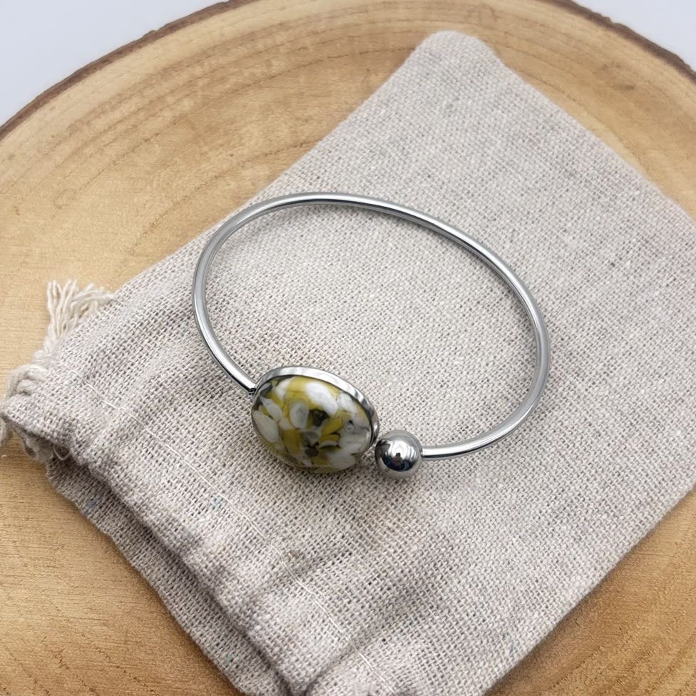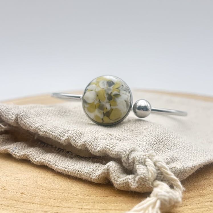 Le bracelet "Jonc plat" se compose d’une perle de verre filé au chalumeau et d’un bracelet cabochon de 20 mm en acier inoxydable. Ce mélange de matériaux assure une durabilité et une élégance. La collection « Anis » révèle un vert doux et lumineux, parfait pour accompagner vos tenues d’été. Fraîche et délicate, cette teinte subtile apporte une touche de légèreté, d’élégance et d’originalité à votre style. Matériaux : - Apprêts en acier inoxydable couleur acier - Perles en verre filé au chalumeau