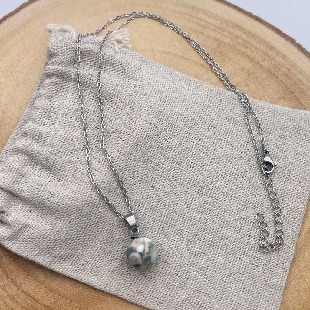 Le modèle collier « petite perle » est composé d’une perle de verre filé au chalumeau, d’une coupelle avec anneau et d’une chaîne de 45 cm en acier inoxydable. Ce choix de matériaux garantit une durabilité et une élégance. La collection « Cielo » séduit par son bleu doux et apaisant. Élégante et délicate, elle accompagne parfaitement vos tenues estivales en apportant une touche de fraîcheur, de finesse et de raffinement. Matériaux : - Apprêts en acier inoxydable couleur acier - Perles en verre filé au chalumeau