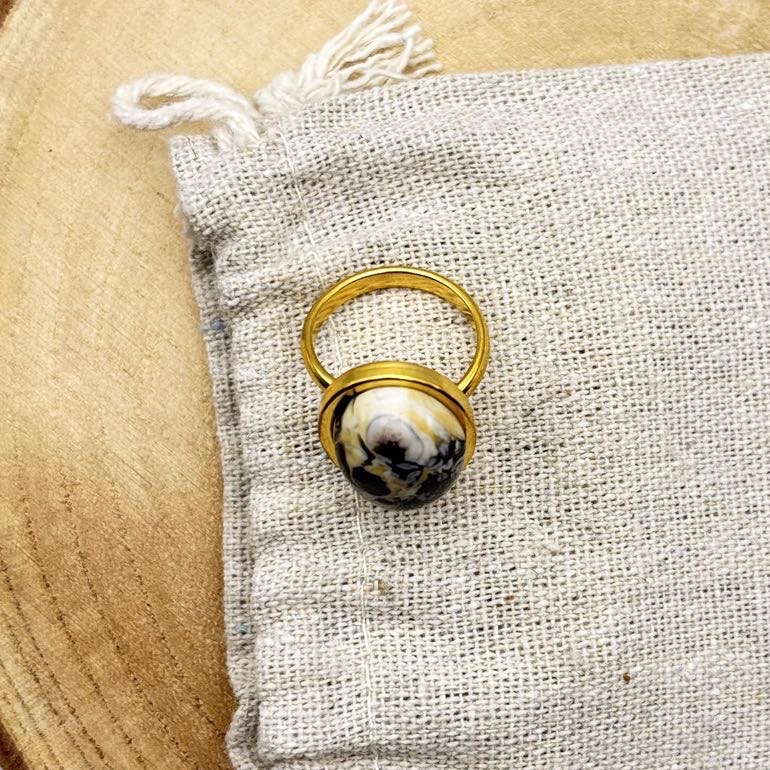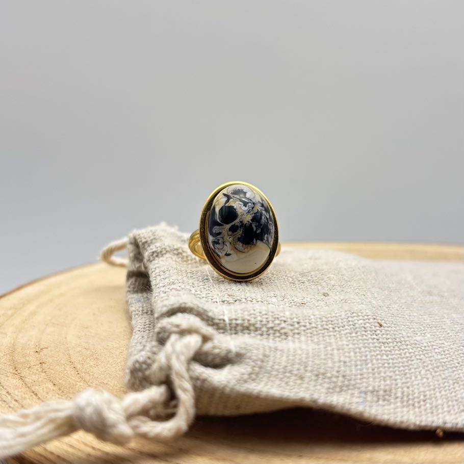 La bague cabochon ovale est composée d’une perle de verre filé au chalumeau et d’une bague plateau de 18x13 mm en acier inoxydable. Ce mélange de matériaux de qualité garantit un bijou élégant et résistant, parfait pour un usage quotidien ou pour des occasions spéciales. La collection de bijoux « Intense » se distingue par l'intensité de sa luminosité dans les tons beige, blanc et noir. Ces couleurs classiques et contrastées créent une allure audacieuse et élégante, illuminant votre style avec une sophistication moderne. Matériaux : - Apprêts en acier inoxydable couleur or - Perles en verre filé au chalumeau