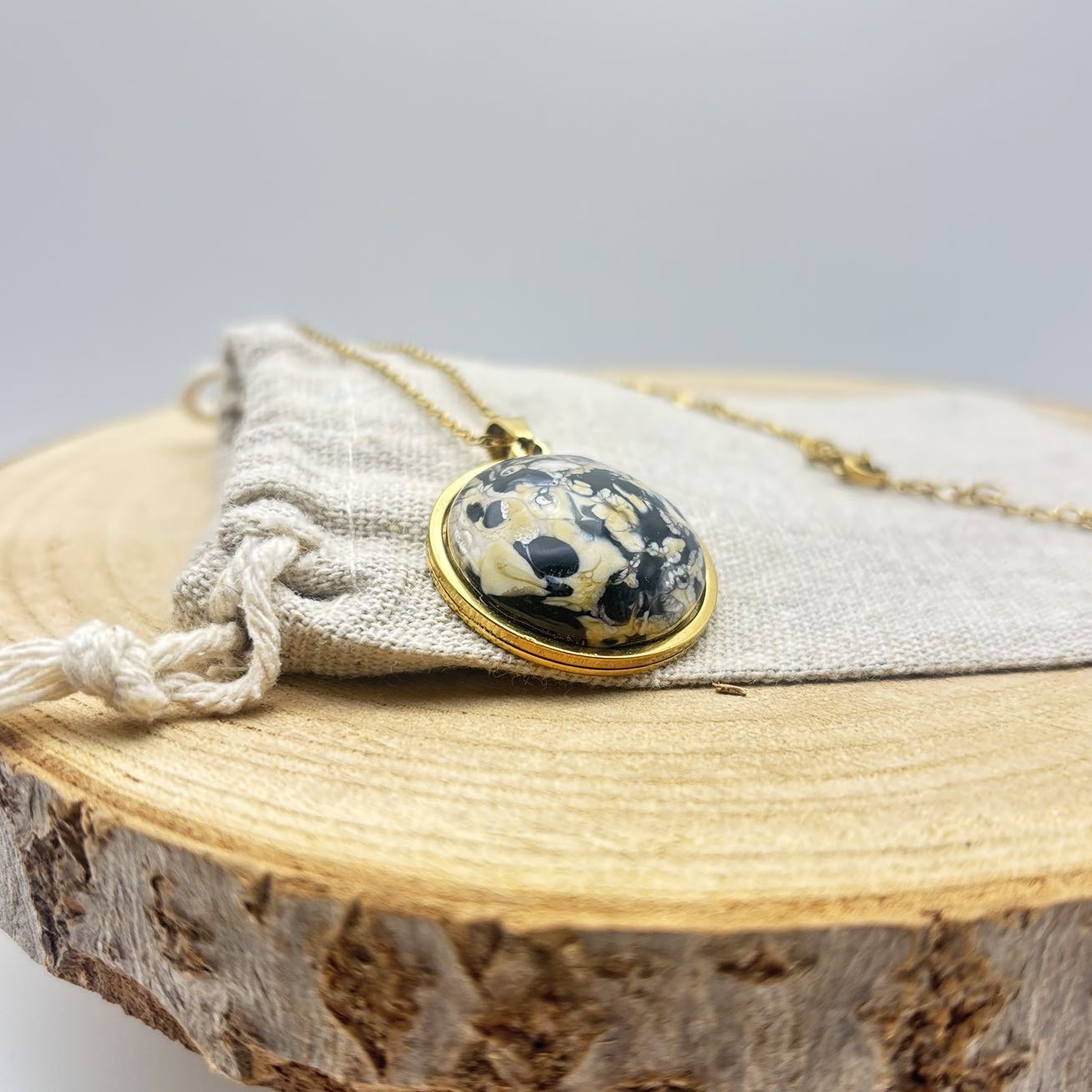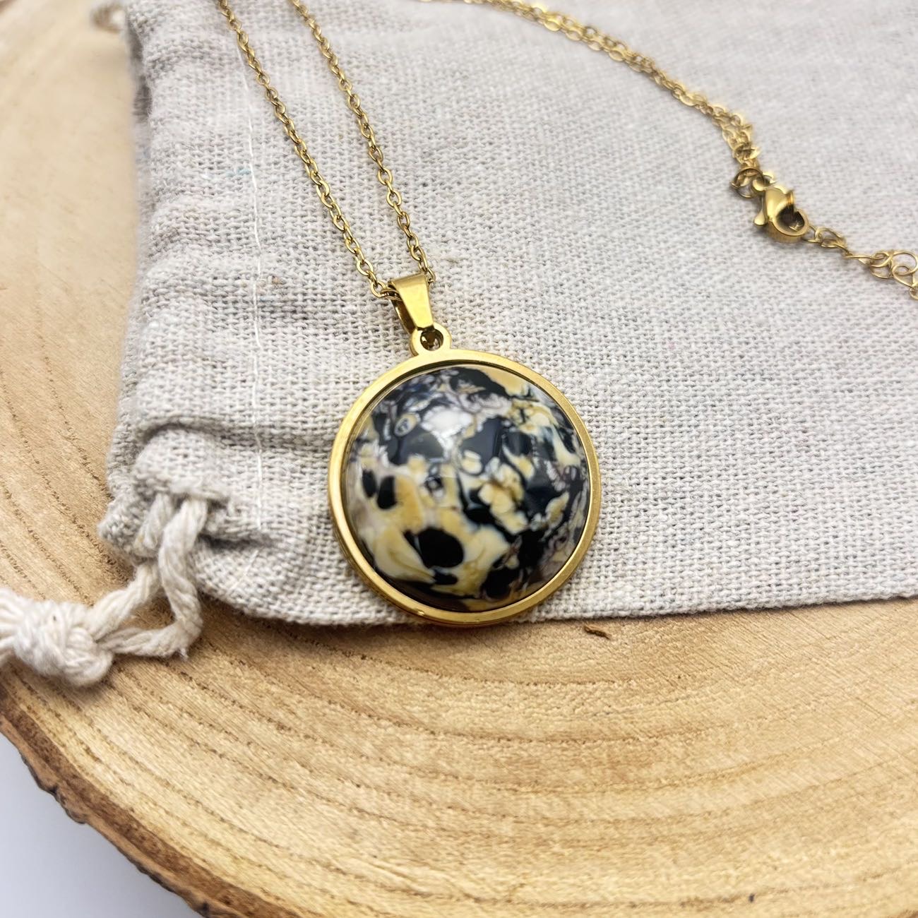 Le collier “cabochon” est composé d’une perle de verre filé au chalumeau, montée sur un plateau et une chaîne de 45 cm en acier inoxydable. Cette combinaison de matériaux assure une qualité et une durabilité.