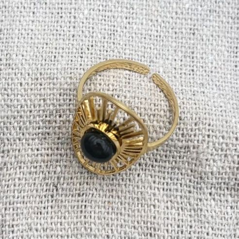 La bague soleil est composée d’une perle de verre filé au chalumeau de 6 mm et d’une bague plateau ovale en forme de soleil en acier inoxydable. Ce mélange de matériaux de qualité garantit un bijou élégant et résistant, parfait pour un usage quotidien ou pour des occasions spéciales. La collection « Intense » se distingue par son noir profond, une teinte moderne et élégante qui apporte du caractère à vos tenues. Matériaux : - Apprêts en acier inoxydable couleur or - Perles en verre filé au chalumeau